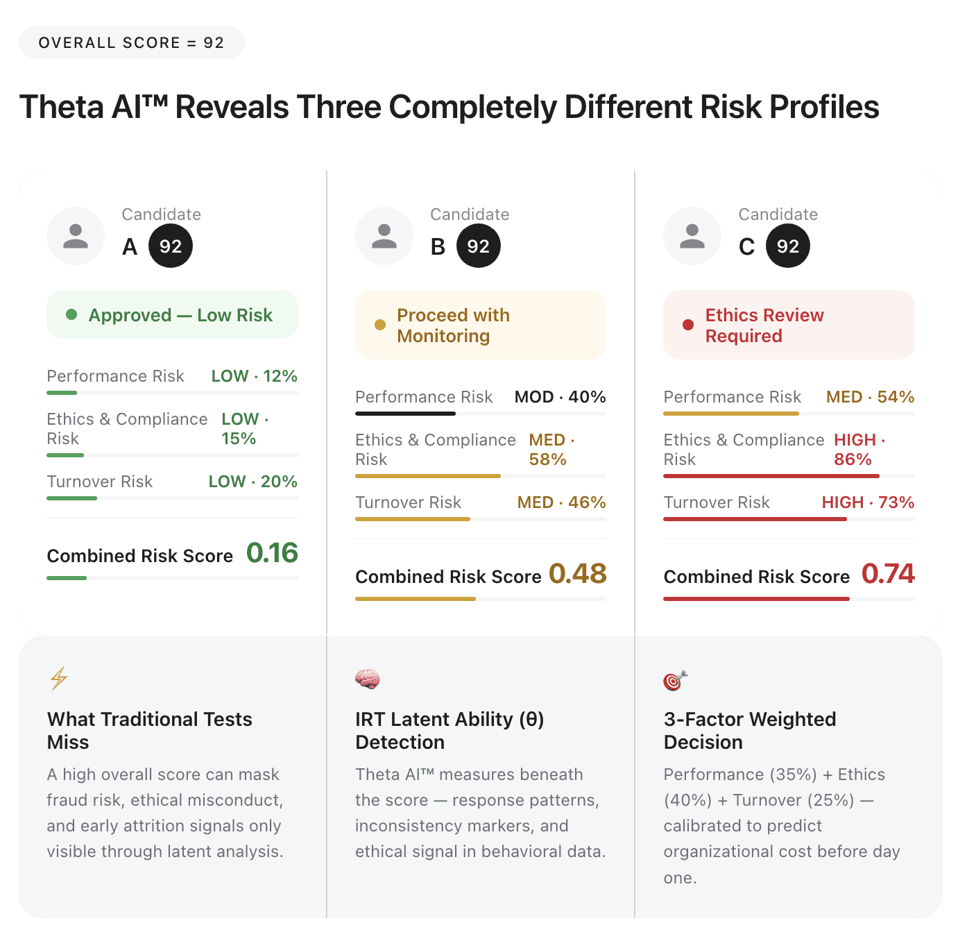 Theta AI™ integrates behavioral, ethical, and latent ability metrics to provide a holistic view of candidate potential. The candidate demonstrates strong predicted performance, minimal ethics and compliance risk, and balanced future adaptability and retention potential, indicating a high likelihood of sustained success in the role.